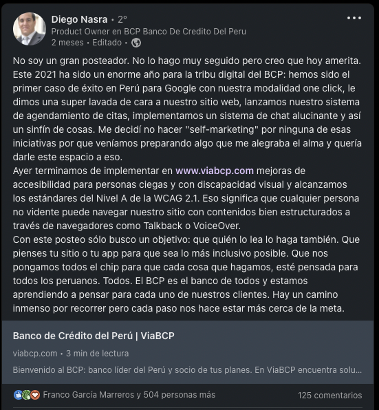 Anunciado hace un par de meses por Diego Nasra, actual Product Owner de VíaBCP. Este hito hace posible que las personas no videntes puedan por fin navegar sin problemas por la web.