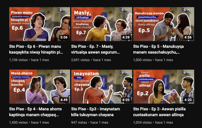 Estuve scrolleando por YouTube cuando me topé con una grata sorpresa: un capítulo de la serie 5to Piso en Quechua y lenguaje de señas. Pensaba que quizás se trataban de subtítulos o algo similar; sin embargo, hablamos aquí de un cambio profesional del audio, así como de la incorporación de expertos en lenguaje de señas en la esquina inferior derecha del video. Simplemente fenomenal.